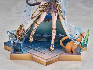 This figure features shiny gold accents, jade-colored lotus motifs, and delicate details that have been carefully recreated to bring Pepe to life. The cat design on the back ribbon has been faithfully crafted by experts, adding a splendid and adorable touch. The surrounding cats and her luxurious, elegant outfitmake her a stunning representation of a Sargonian Padishah’s daughter. Painted plastic 1/7 scale complete product with stand included.