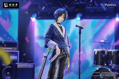 Asaba Harumasa wears a white deep V-neck shirt paired with a ribbed knit sweater. His dark trousers feature delicate drape and folds, with a semi-transparent belt at the waist overlapping the sweater’s fringe, while the pant legs boast unique ripped cut-out designs. With his left hand casually tucked in his pocket, his overall outfit is both casual and full of personality. Beside him, a blue-and-gold electric guitar shimmers with a pearlescent finish, its metallic strings meticulously arranged. The semi-transparent base is engraved with laser-etched patterns that refract dazzling colors.